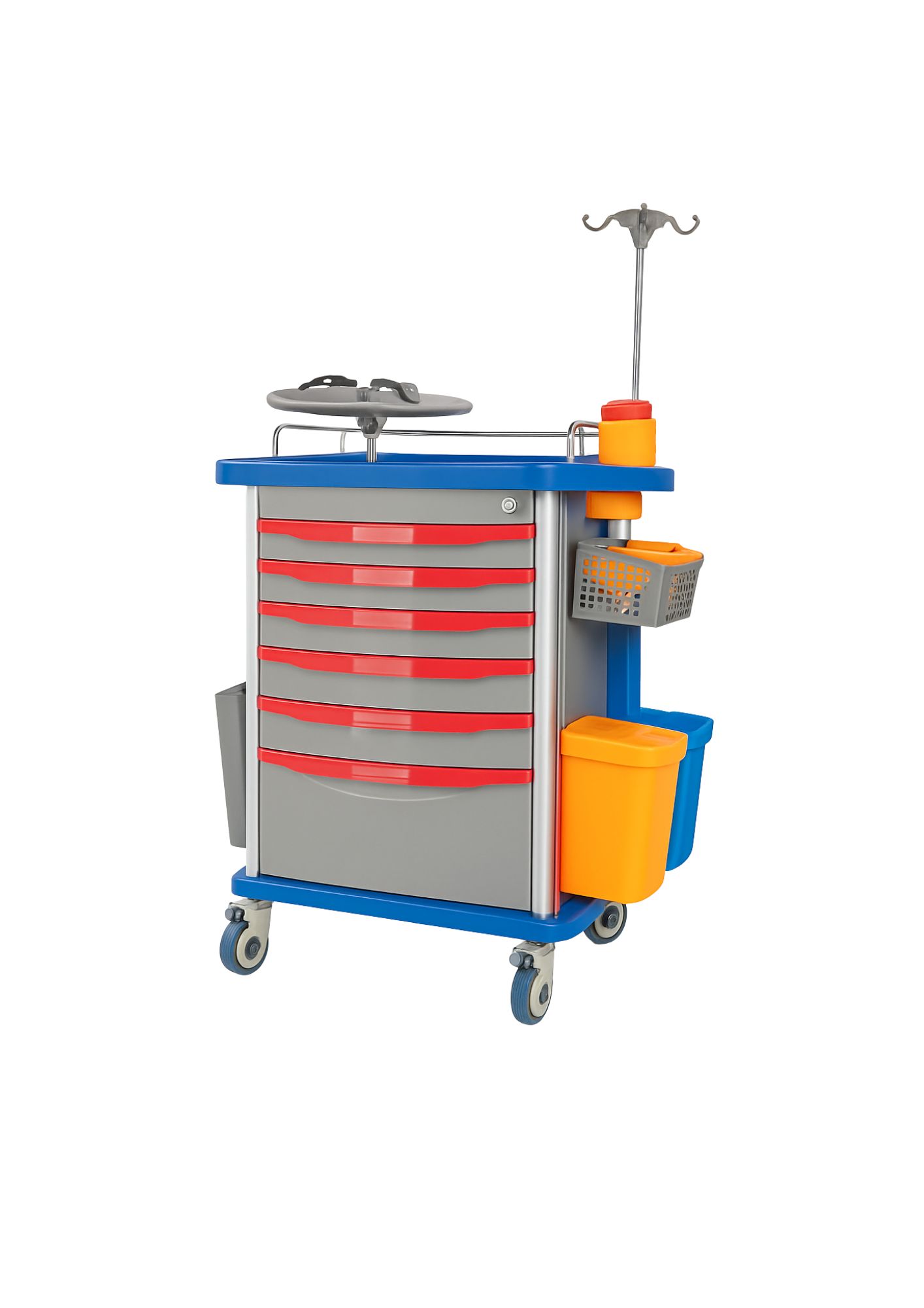 - Cesta para el polvo, soporte para desechar agujas, portasueros,estante para desfibrilador, tablero para desfibrilador, toma de corriente y ganchos, soporte para tanque de oxígeno, contenedor de utilidades, caja de almacenamiento.