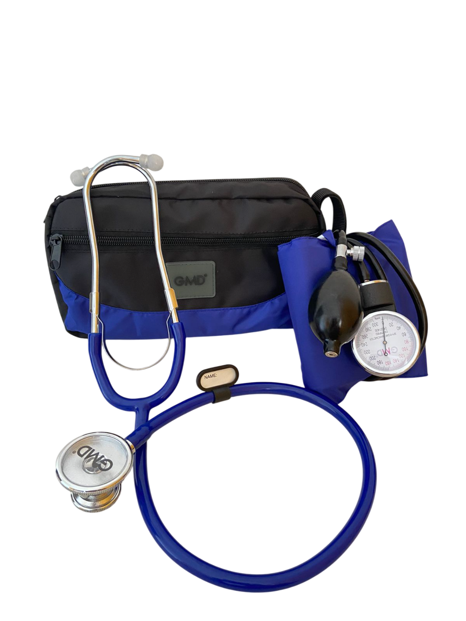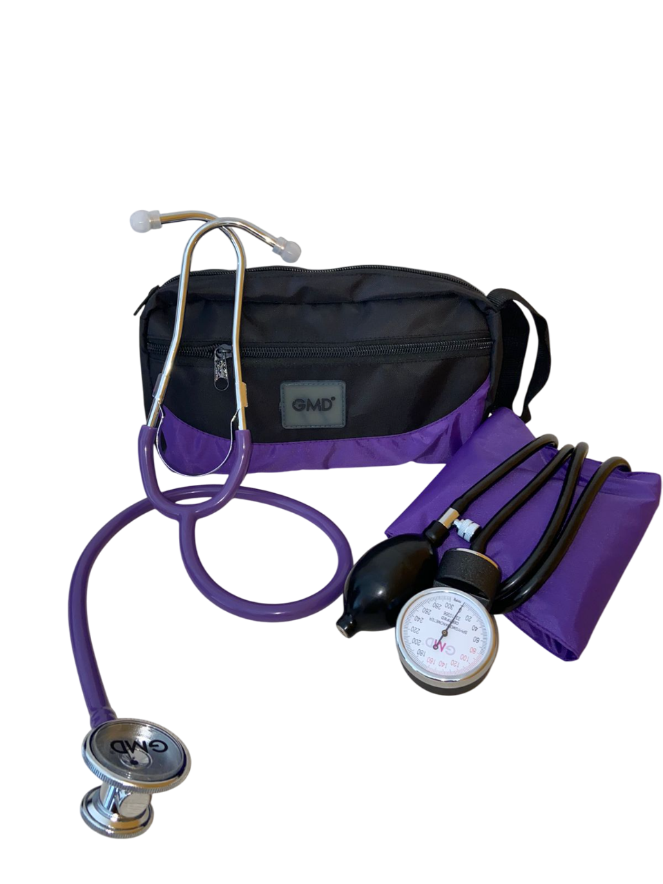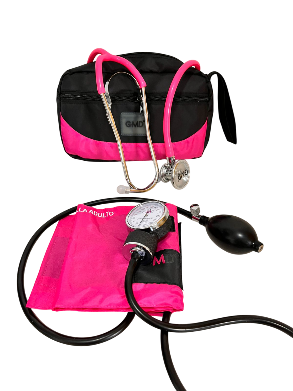 Disponible en varias combinaciones de colores, este kit cuenta con un tensiómetro aneroide y un fonendoscopio tipo rappaport.